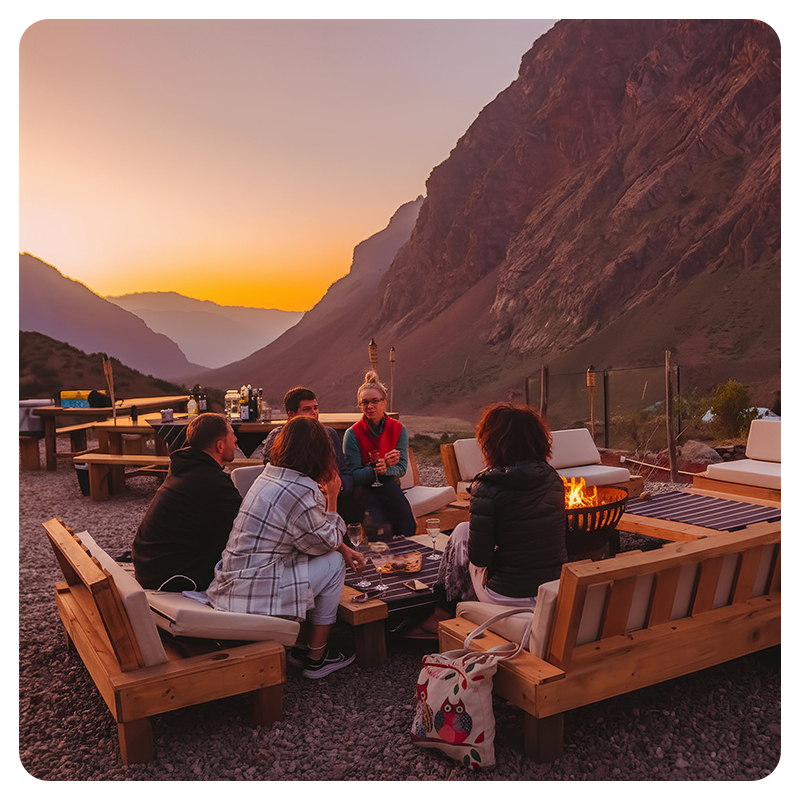 Atardecer en el Cajón del Maipo: visita pueblos, la Casa del Chocolate, disfruta termas, asado chileno y vino mientras contemplas el atardecer y luego un cielo estrellado en plena cordillera.